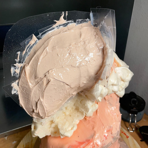 Eventually, I end up with a 2 part mother mold that can be split apart. Ignore the fact that there are actually 4 parts here (the top tan head parts and the bottom pink parts). That is because I was intending to cast the head first with the embedded eyes and then continue with the rest of the body. It did NOT work out. The neck was too thin to allow me to get in there and place the eyes. So I just screwed the 2 parts together and abandoned that idea. It would just have to be a decoration 😞.